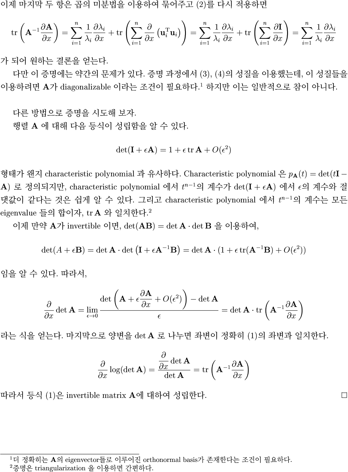 \[\DeclareMathOperator{\tr}{tr}\newcommand{\inv}{^{-1}}\newcommand{\A}{\mathbf{A}} \frac{\partial}{\partial x} \log (\det \A) = \tr \left(\A \inv \frac{\partial \A}{\partial x}\right)\]