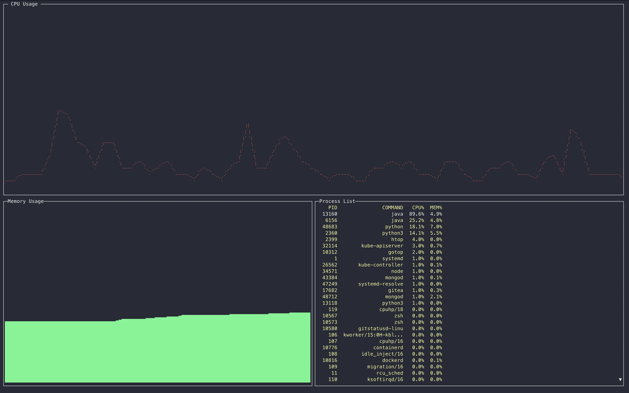 - 내가 했던 프로젝트는 gotop 이라는 프로젝트로, 리눅스 명령어 top 을 Go 로 구현한 것이다. 그렇다고 해서 완전히 top 이랑 동일하지는 않고, 어느 정도 GUI 를 만드려고 했다.